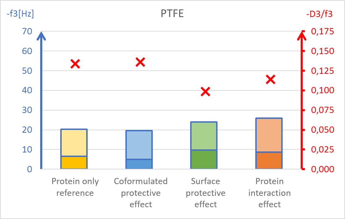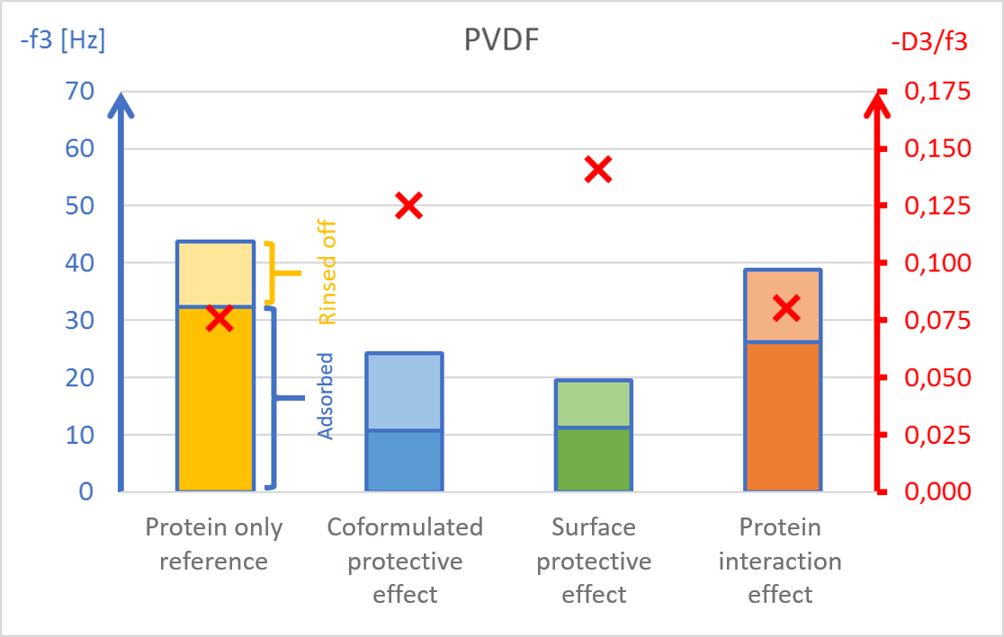 Li等人应用QCM-D增强了对不同材料表面表面活性剂-蛋白质稳定机制的理解。表面活性剂如聚山梨酯80 (PS 80)被添加到配方中作为稳定剂,以保护蛋白质免受任何不利的表面诱导效应。
