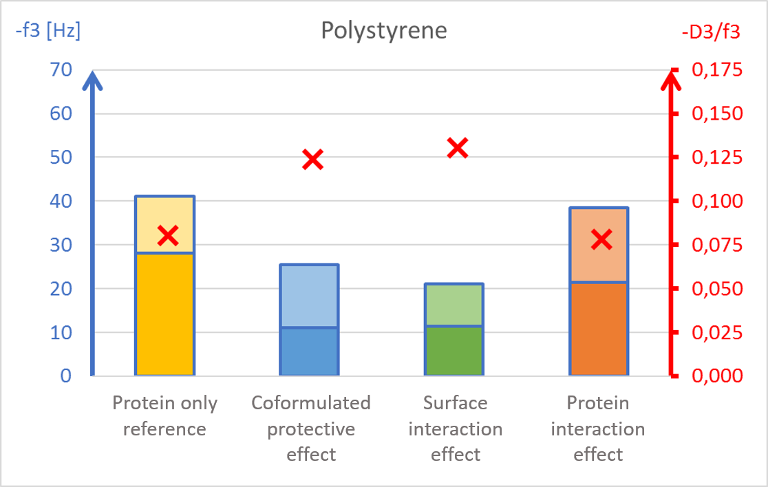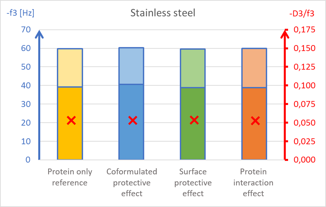 结果表明,聚山梨酯20对蛋白质的保护作用取决于所研究的表面材料。这个例子展示了表面活性剂如何通过在蛋白质和材料表面之间形成保护屏障来保护蛋白质不与表面相互作用。该数据还可能表明蛋白质在吸附到特定表面(如不锈钢)时的变性以及在进一步的表面相互作用中聚集的潜在风险。