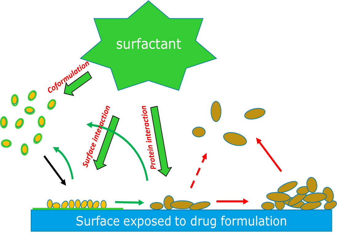 - coformulation.:药物配方中的表面活性剂在蛋白质分子上形成保护涂层,这反过来防止它们粘附在表面上。