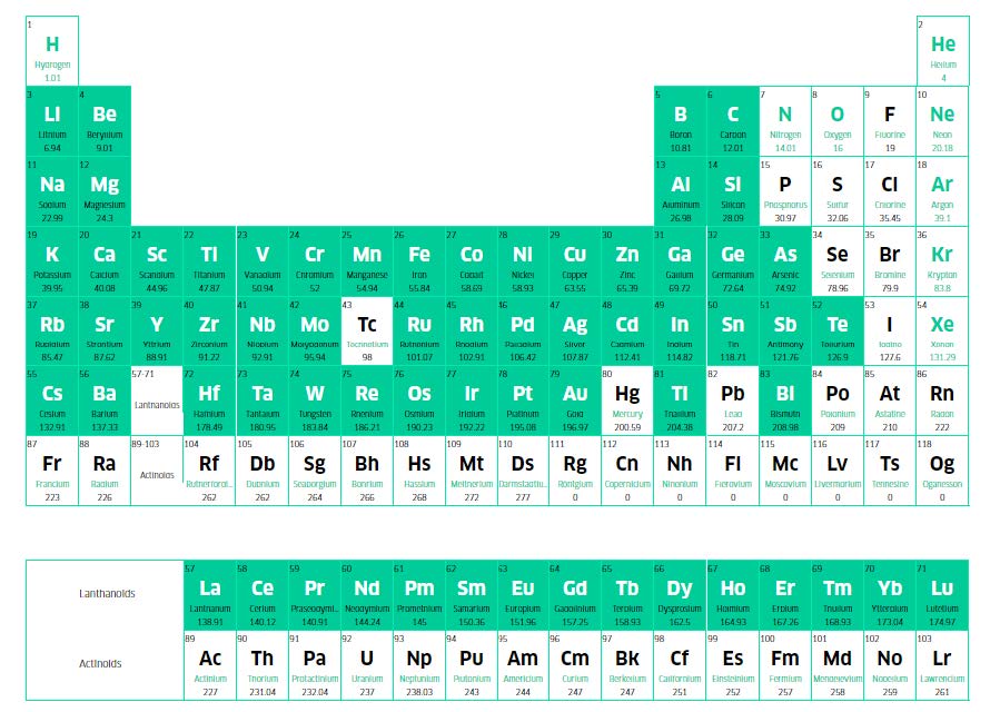 绿色突出显示的元素与电火花烧蚀兼容。绿色元素可用于电火花烧蚀过程(例如作为载气或改进剂)。